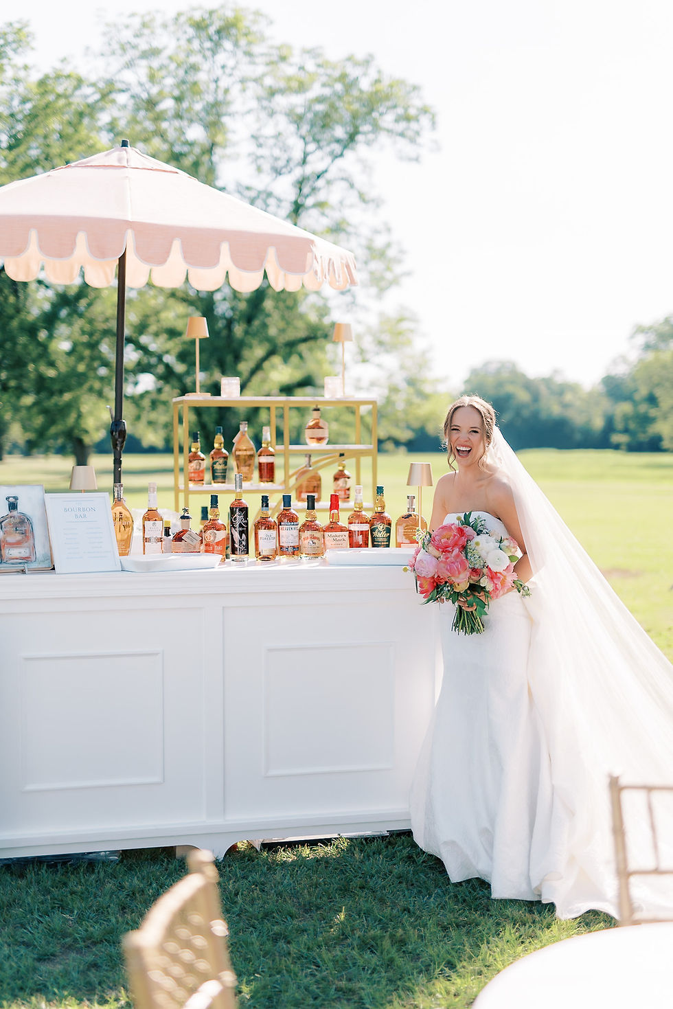 The bride carried a vibrant bouquet of coral peonies, ranunculus, and garden roses—echoed throughout the day in towering centerpieces, overflowing urns, and cascading arrangements under the reception tent. Custom elements made the event feel personal and unforgettable, including a bourbon bar featuring branded orange peel garnishes with the couple’s initials.